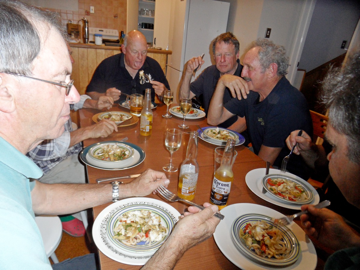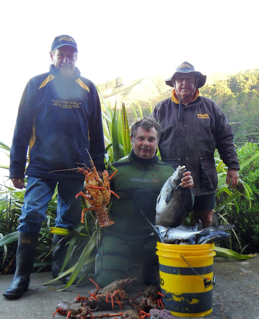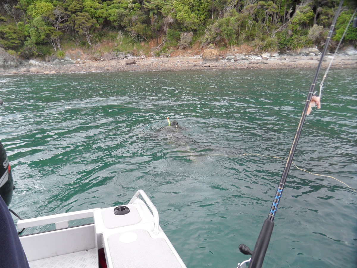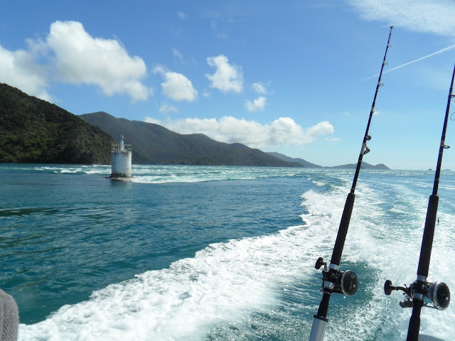 The Marborough Sounds area is closed for Blue Cod fishing so we tried to avoid catching them, and tried to catch other species. With the exception of George and his spear, the takings were meager but we caught a wide selection of species - Snapper, Tarakihi, Moki, Butterfish, Blue Cod (though the Pass, out of the "Sounds" area. Also Barracouta, Spiny Dogfish (very plentiful - the prime catch on setline), Carpet Sharks, and Octopi.